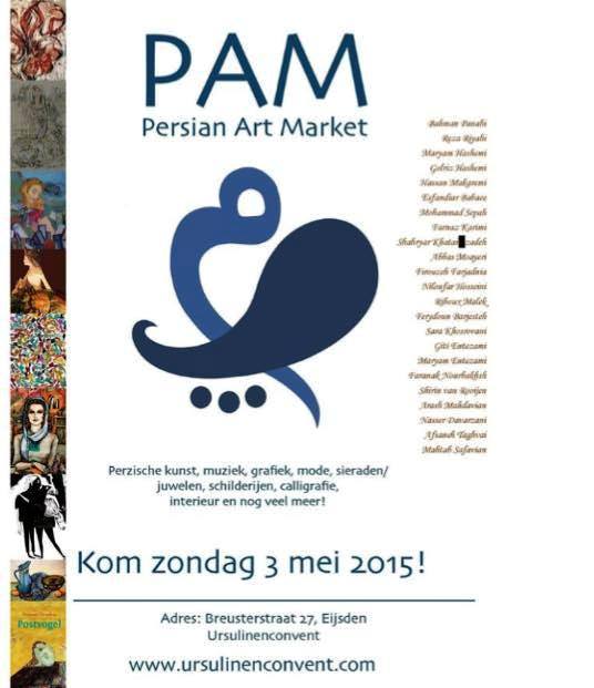 امسال برای دومین سال پیاپی به همت انجمن فرهنگی هنری پام(Persian Art Market)بازارچه فرهنگ و هنر ایرانیان در شهر ایسدن استان لیمبورخ هلندبرگزار گردید.در این نمایشگاه آثاری از هنرمندان ایرانی از کشورهای هلند،فرانسه،بلژیک و آلمان در زمینه های موسیقی،طراحی،مد،جواهرات و زیور آلات،نقاشی،مجسمه سازی،خطاطی و طراحی داخلی در معرض دید بازدیدکنندگان ایرانی و غیر ایرانی ساکن کشورهای مختلف اروپایی بویژه هلند قرار گرفت.