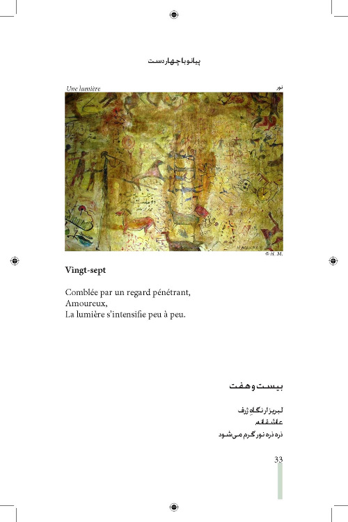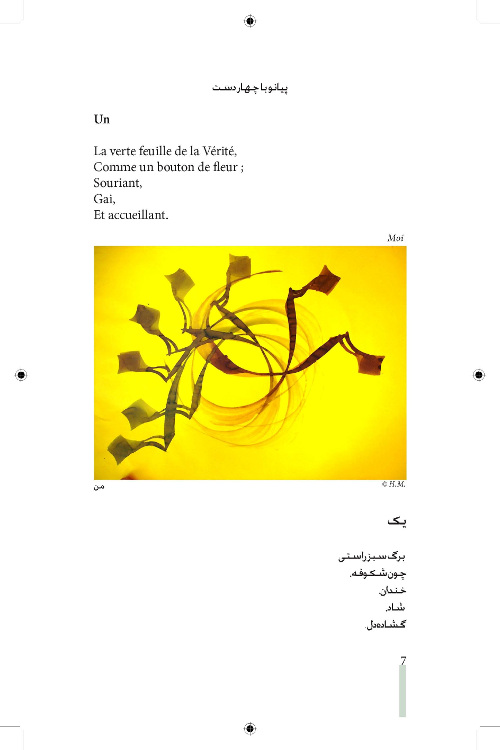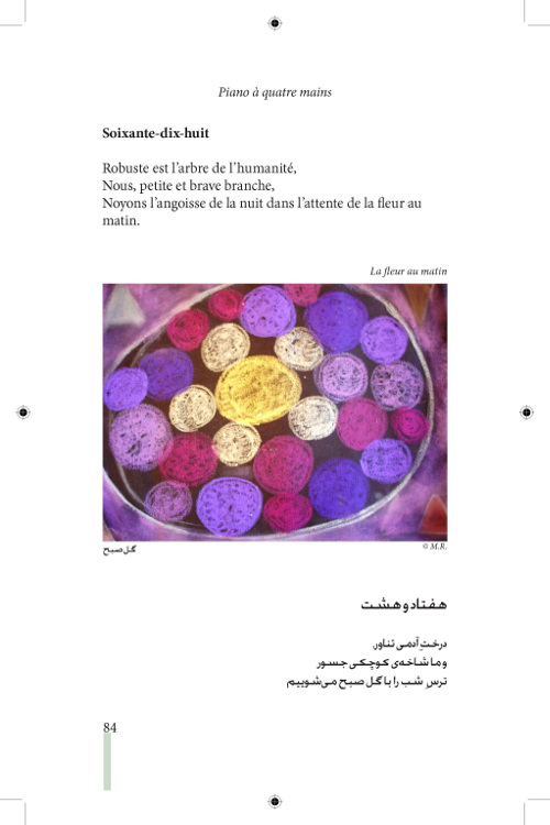 Ce livre est un ensemble de cent Parevareh, (morceau choisi comme les morceaux de musique) que nous appelons « piano à quatre mains ». Les Parevareh sont les reflets des images courtes brèves qui nous traversent et nous font promener dans l’ambiance du moment. C’est pourquoi ces images sont les veines colorées et les rythmes des voies de l’univers qui nous entourent.