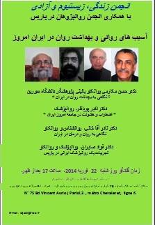 مورد : آسیب های روانی و بهداشت روان در ایران امروز . با شرکت: دکتر حسن مکارمی روانکاو بالینی پژوهشگر دانشگاه سوربن :” نگاهی به بهداشت روان در ایران “ ؛ دکتر اکبر پویانفر، روانپزشک : " اضطراب و خشونت در جامعه امروز ایران " ؛دکتر نادر آقا خانی، روانشناس و روانکاو :نگاهی به روان و درمان در ایران؛ دکتر فواد صابران، روانپزشک و روانکاو : تجربیات یک روانپزشک ایرانی در پاریس.